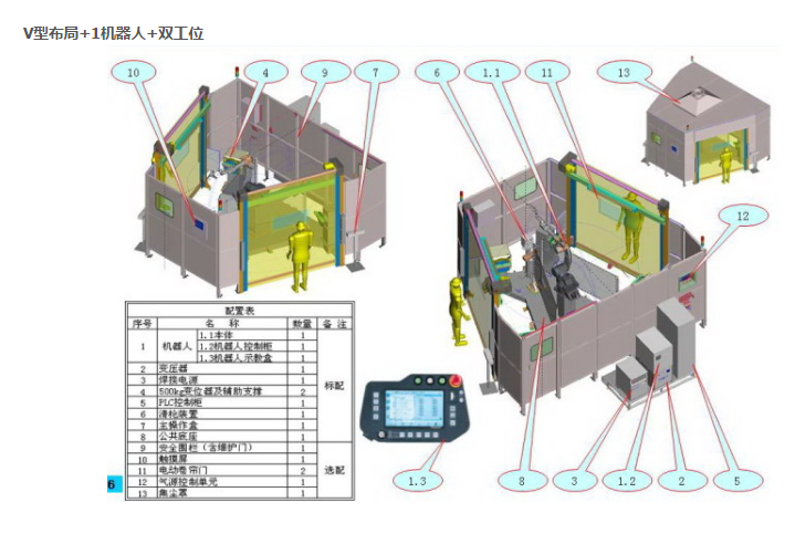 工作站配备2个水平转盘,每个工作台配备一组固定装置。可以通过工作台旋转180°来更动两个固定设备的位置。操作员在外部装卸工件,机器人在内部进行焊接,从而有效地缩减了辅助工作时间
